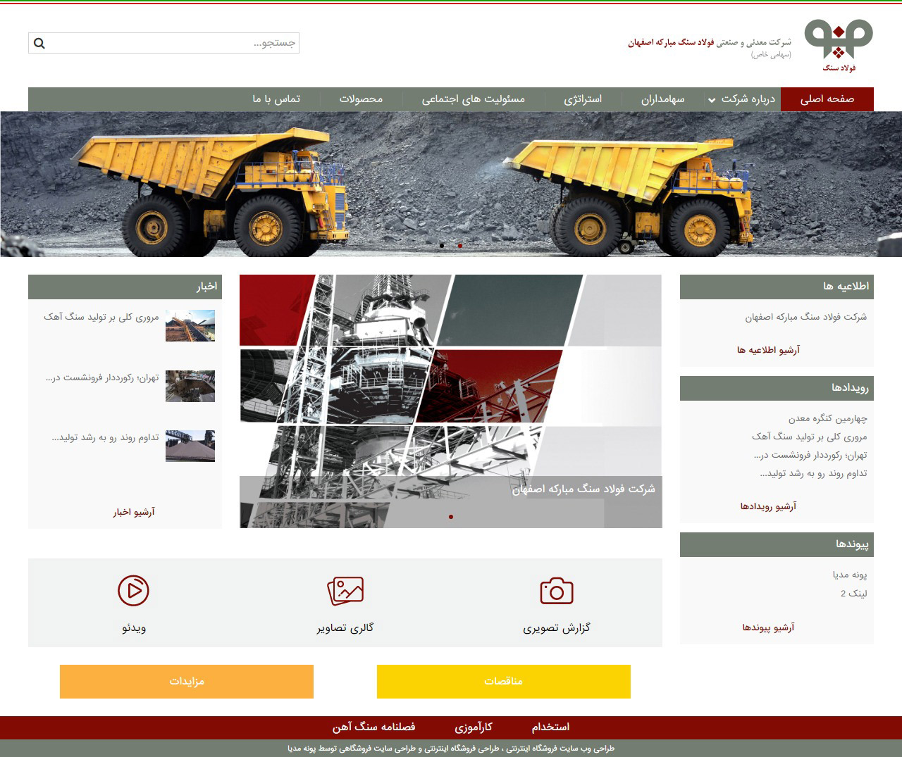طراحی سایت فولاد سنگ با هدف اطلاع رسانی مخاطبین انجام شده است. برای این منظور سه بخش در سایت با عناوین “اخبار”، “رویداد ها” و “اطلاعیه ها” ایجاد شده است. بخش اخبار، برای مشاهده اخبار مرتبط با این حوزه صفحه مربوط به اخبار طراحی شده است. در صفحه مربوط به رویداد ها، رویداد هایی که مرتبط با حوزه معدن و صنعت برگزار می شود، اعلام می شود. در بخش اطلاعیه های سایت نیز اخبار و موضوعاتی که مرتبط با زمینه فعالیت شرکت نمی باشد، اطلاع رسانی می شود. با توجه به اینکه برخی از گزارشات شرکت فولاد سنگ تنها به صورت تصویر بود، صفحه ای با عنوان گزارش تصویری طراحی شد که در آن رویدادهای مربوط به فولاد مبارکه، به صورت تصویر قابل مشاهده می باشد. گالری تصاویر، گزارش تصویری و ویدئو برای توضیحات بیشتر فعالیت های این شرکت در نظر گرفته شده است.